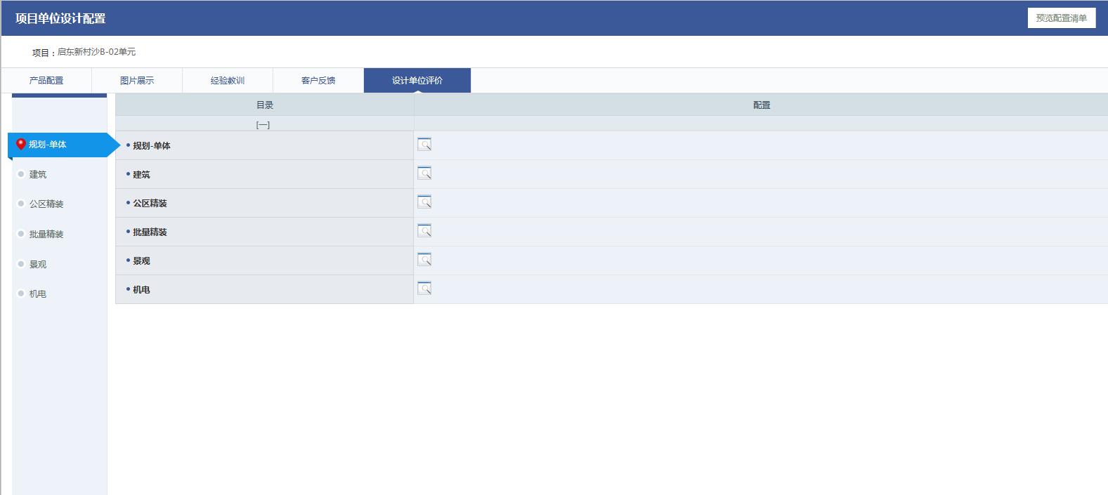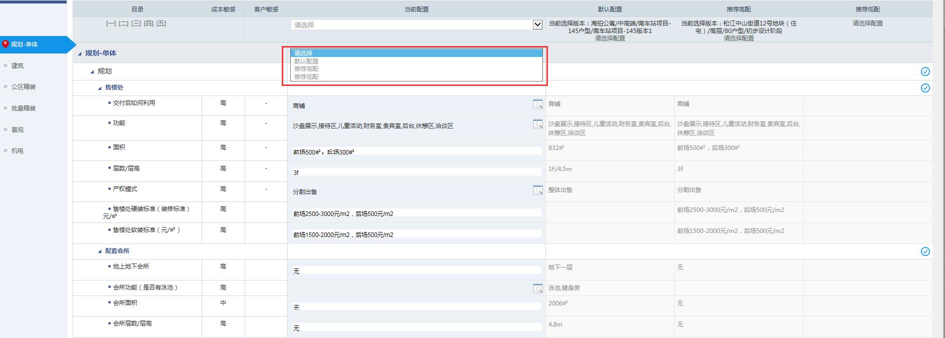 方案阶段,设计人员可对标已有项目或参考产品线标准配置,辅助新项目初步配置。如新项目A属于公寓类产品,进行项目配置时,可对标以往公寓类产品线的历史项目,也可直接对标公寓产品线的项目配置标准。