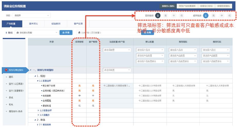 产品配置时,系统可对各配置项进行成本敏感、客户敏感描述和排序,配置时实时提醒设计人员注意相关配置不要超额。配置完成后,输出的核心指标/限额指标可用来配合营销及成本合约工作。配置的所有部品标准,后续将作为成本及合约工作的指导。