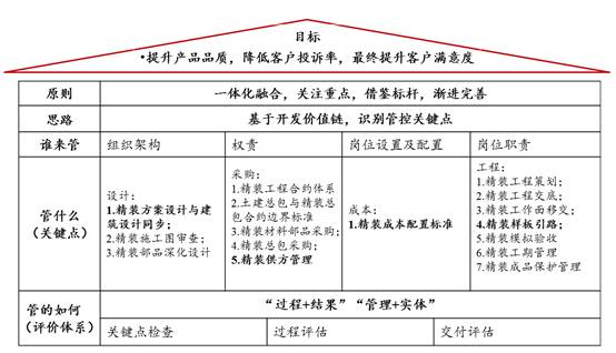 “提升产品品质、降低客户投诉率、最终提升客户满意度”是企业管好精装产品的最终目标。精装交付产品到底怎么管?对于缺乏精装管理经验的企业来说,应重点解决3个问题:即“谁来管—组织”“管什么—流程及关键点”“管的如何—绩效考核”。从而实现“人员能力适配,流程指引适配,考核机制适配”。