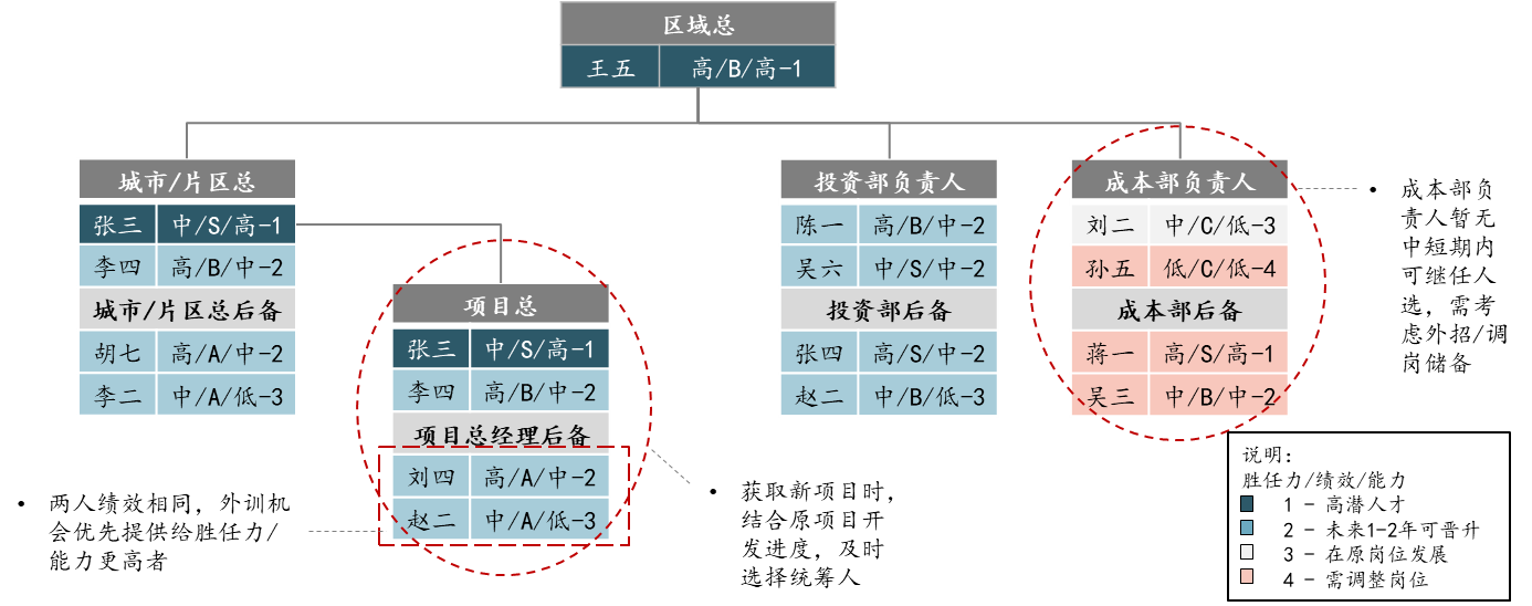 人才胜任力标准构建完成后,可基于模型具体维度开展人才盘点及评价工作。对于中基层岗位,应重点关注专业能力评价,用更加实战的评价方式,如专业能力KPC测评(各岗位专业知识及能力测评)、竞合游戏、情景挑战以及无领导小组等,将具体的业务场景融入题本,考察业务实操知识及能力。