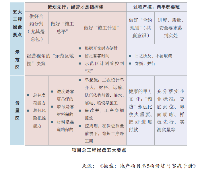 应对这一问题,要从项目总的工程操盘意识和知识面上提前进行准备,从而帮助预判和决策,避免不可挽回的情况出现。项目总工程操盘有五大要点,一是合约分判(尤其是总包),二是施工总平,三是施工计划,四是合约规划,五是进度、质量和安全落实。如表6。