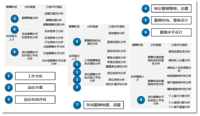 第一步:工作分析;第二步:岗位分类;第三步: 岗位价值评估;第四步:制定薪酬策略、薪酬总额;第五步:薪酬结构、等级设计;第六步:薪酬水平设计;第七步:制定薪酬管理制度和流程。