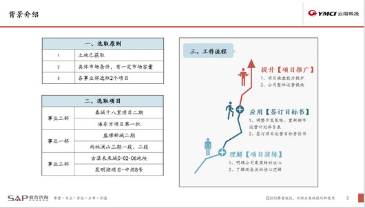 赛普大运营团队5月17日进场后,在集团营销与运营中心积极地推动与配合下,迅速开展了“高周转”试点项目的筛选与运营结果的分析和演练,以配合相关激励机制的落实。基于行业标准的“高周转”思路,最终选取了6个试点项目,依次进行了开盘时间的推演和开发路径图的演练,梳理了各个项目为实现“高周转”存在的个性及共性的问题清单,罗列出了管理标准和管理能力两大类问题。阶段性演练之后,赛普大运营团队于5月30日下午向云南城投集团的经营班子以及事业部的各位领导进行了“高周转”试点项目运营分析结果的汇报工作。汇报取得了圆满的成功,云南城投在会议上明确了公司高周转的决心,转变了公司原有的“以产定销”的经营思维,以经营目标为导向来实现运营提效,并逐渐推广到所有项目中去。