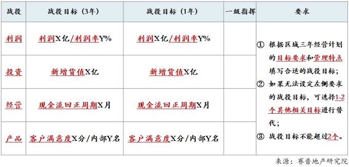 雅居乐区域经营解码沿用集团战略解码的4大战役,即利润、投资、经营与产品4大经营要点,各区域根据各自实际情况进行战役选择,设置战役目标与一级指挥。